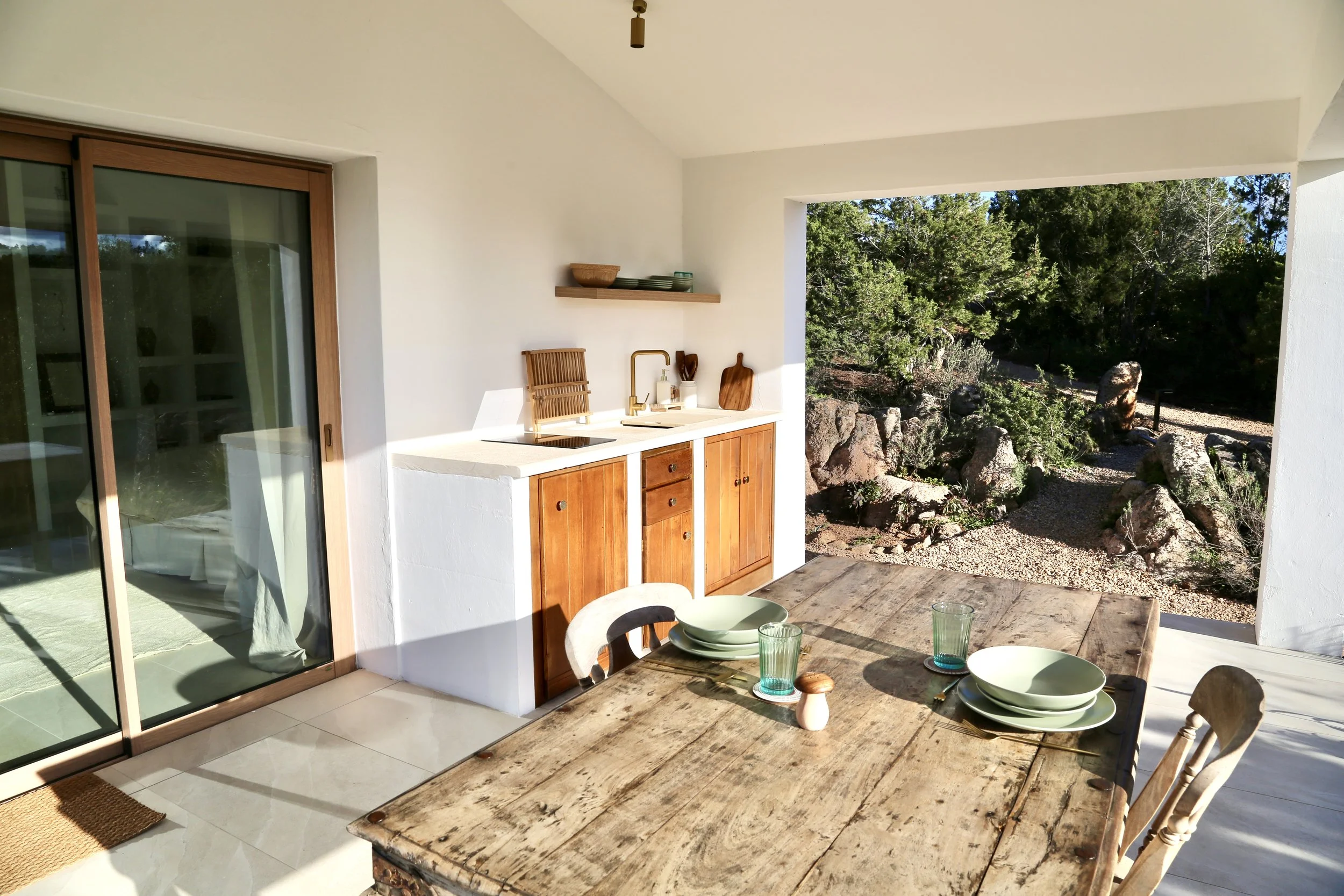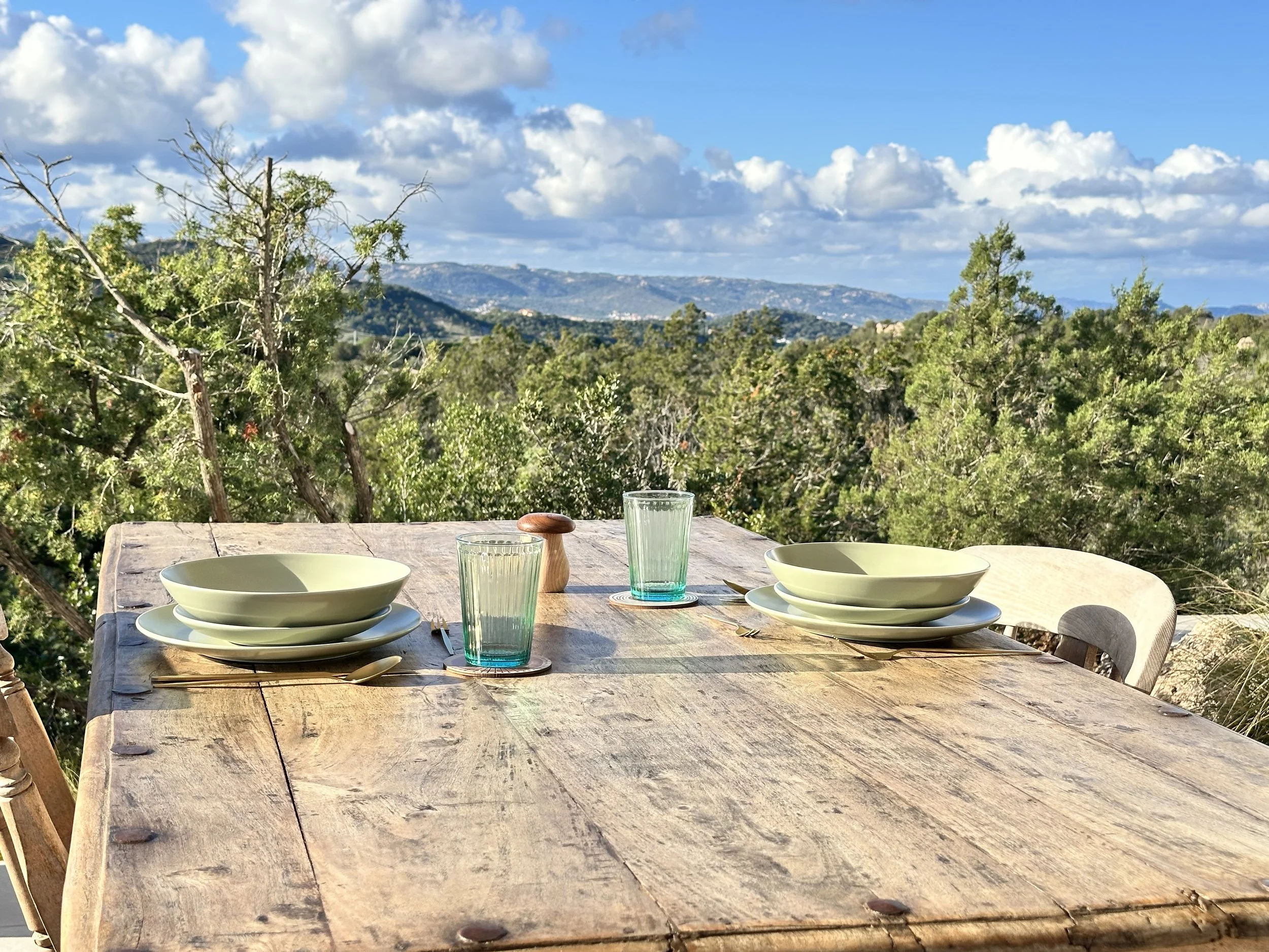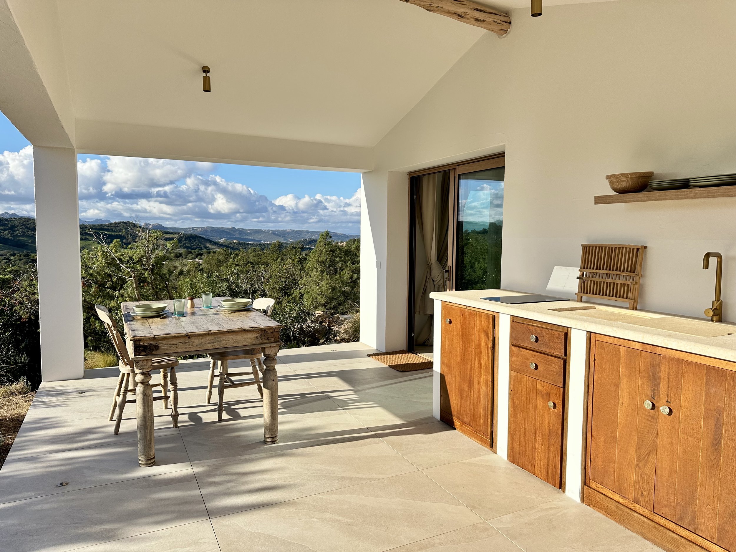 A covered veranda serves as your open-air kitchen and dining space, nestled among aromatic herb gardens and sculpted granite rocks. It’s a place for slow breakfasts in the morning light or candlelit dinners wrapped in Sardinia’s warm evening breeze.