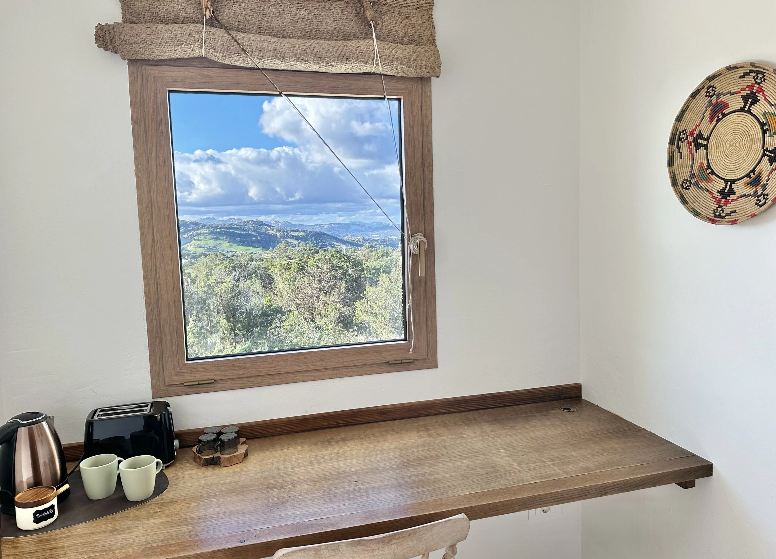 Inside, tall, floor-to-ceiling windows frame the landscape like living artwork. From the desk, you look directly onto the panoramic terrace and vast mountain views — a setting that invites clarity, creativity, and stillness. Even the shower opens onto a private cactus garden through a vertical window, letting nature become part of your bathing ritual.